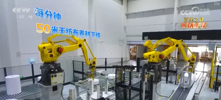 走进这间智能化生产车间,机械臂精准运转,生产线高速飞驰,每分钟就有50米无纺布卷材新鲜下线。这样的生产节奏,在仙桃2000多家非织造布企业里早已是常态。